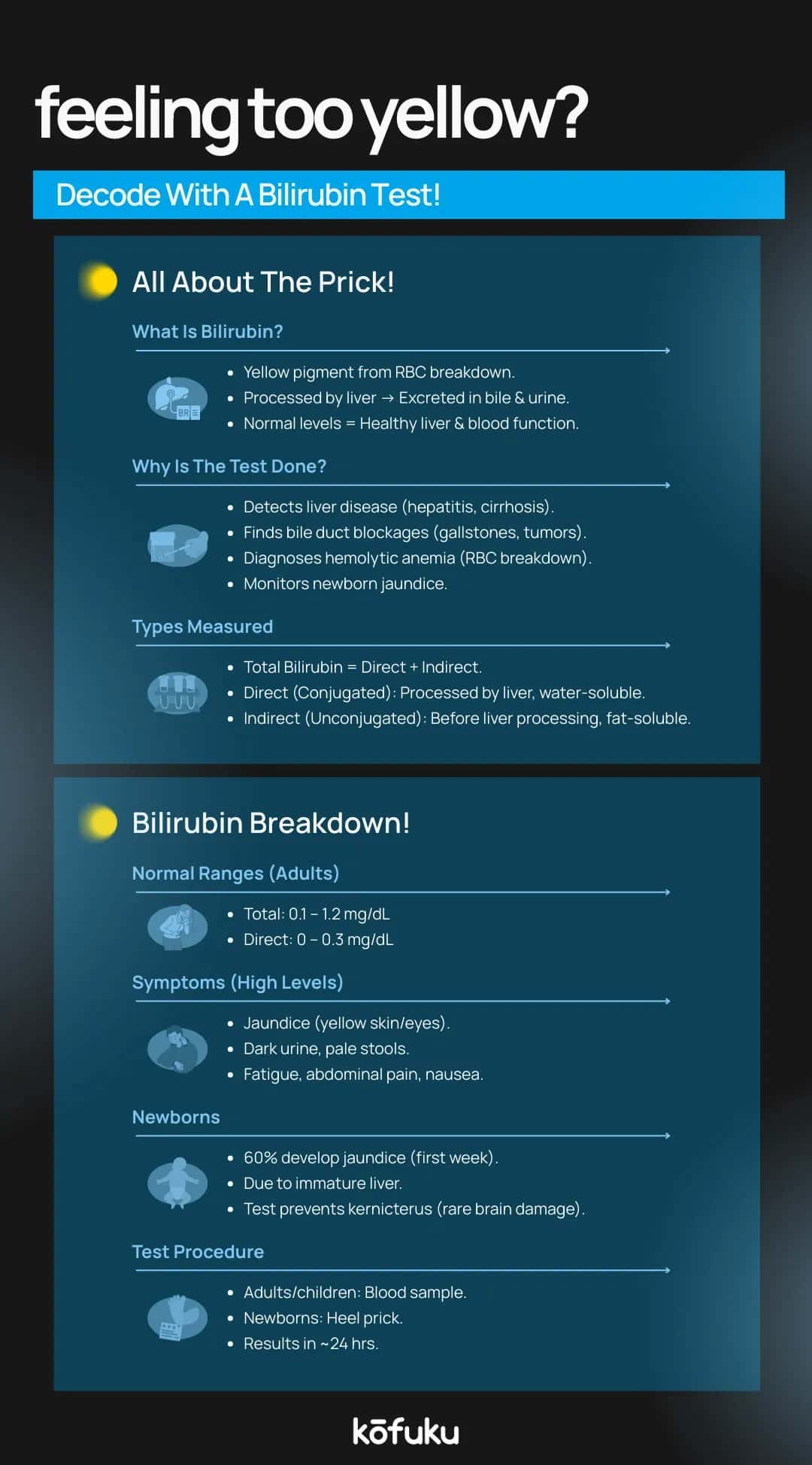 - High bilirubin: Suggests liver disease, hepatitis, bile duct obstruction or haemolytic anaemia. In newborns, elevated bilirubin may cause neonatal jaundice.